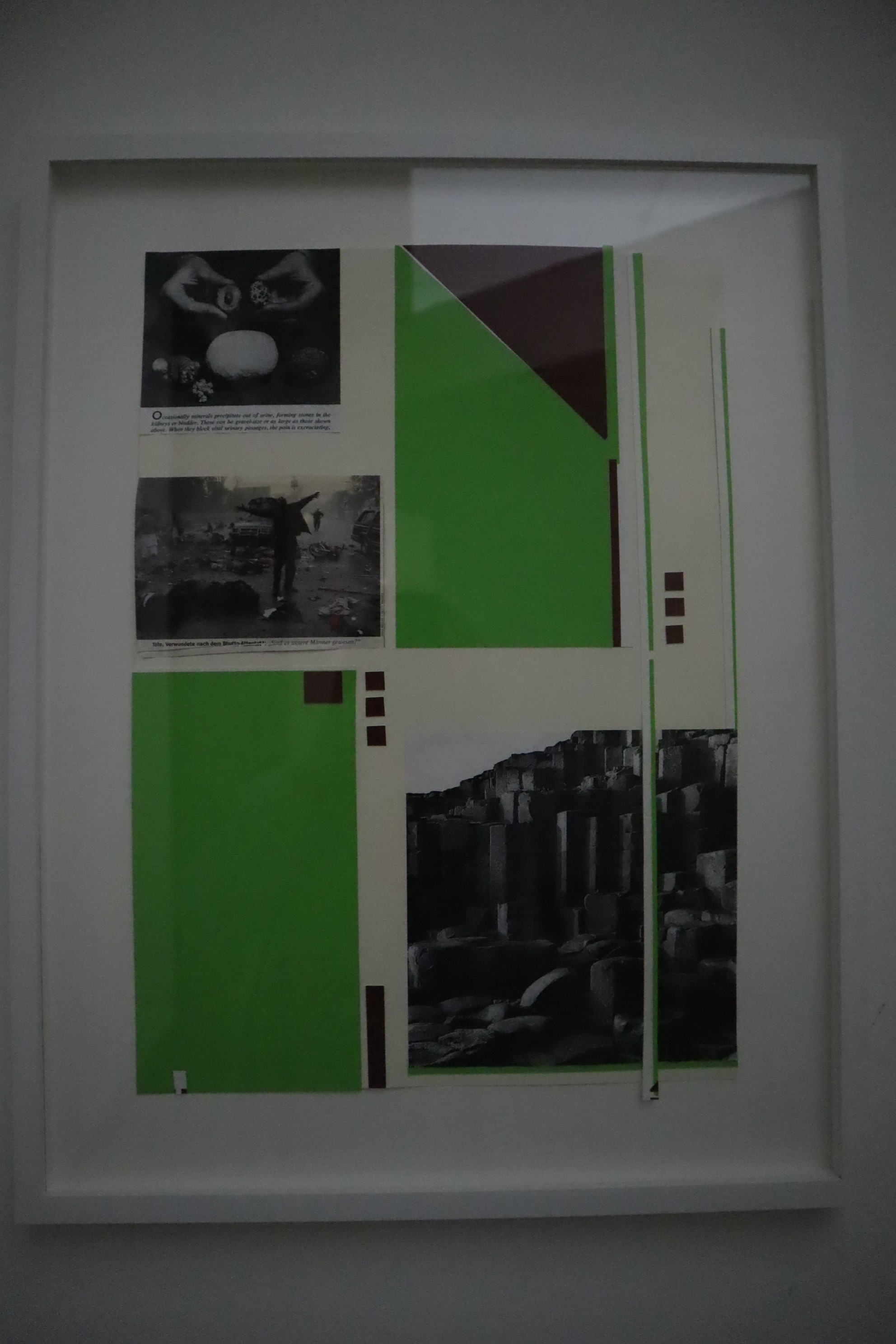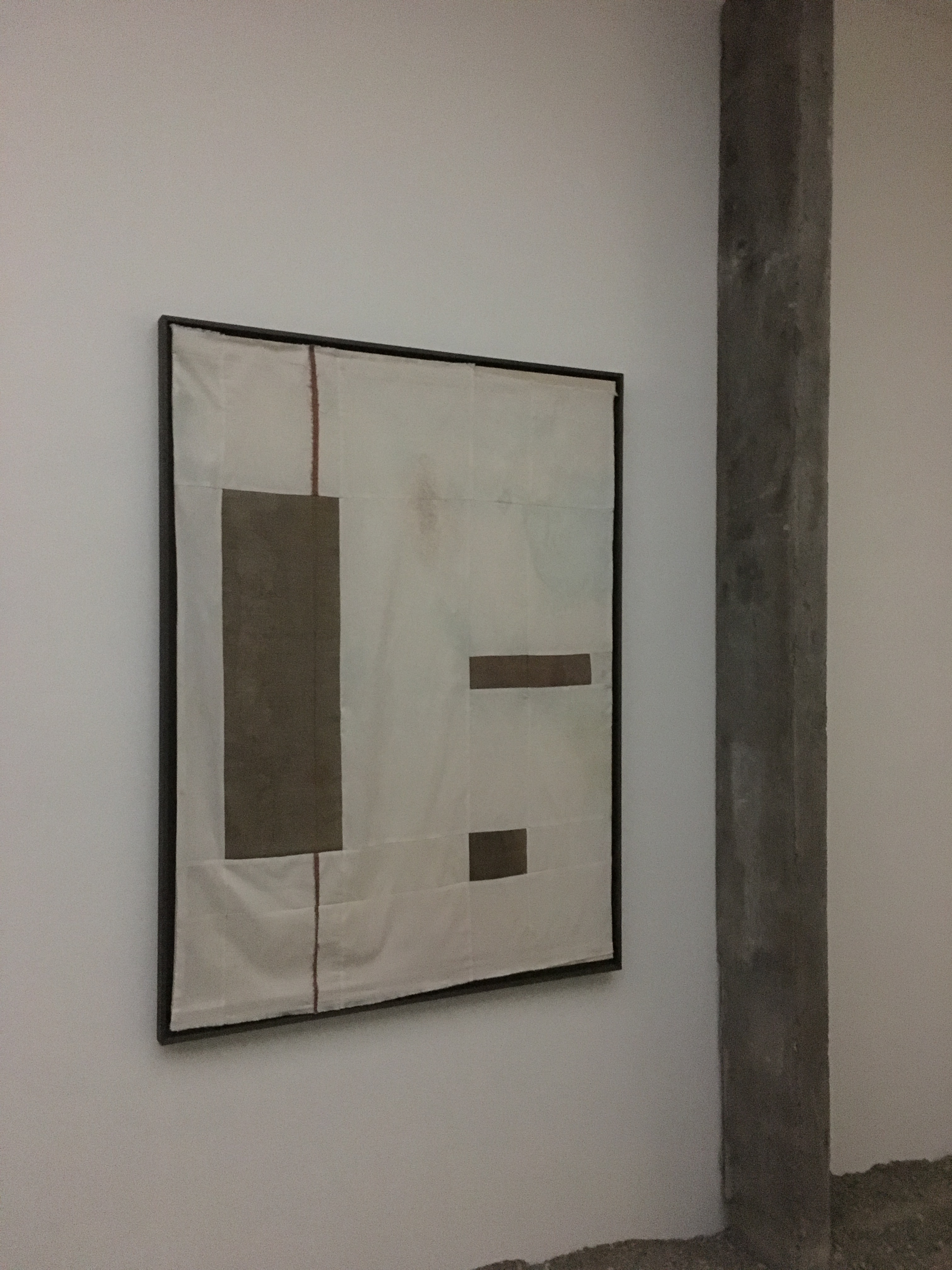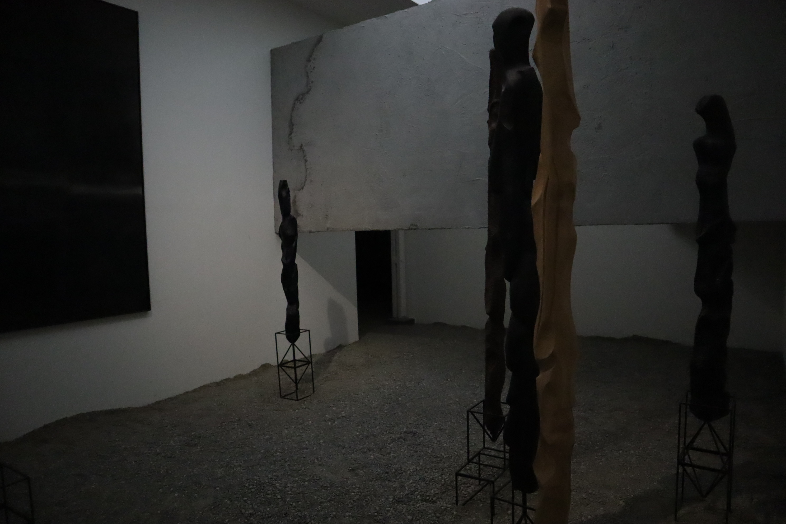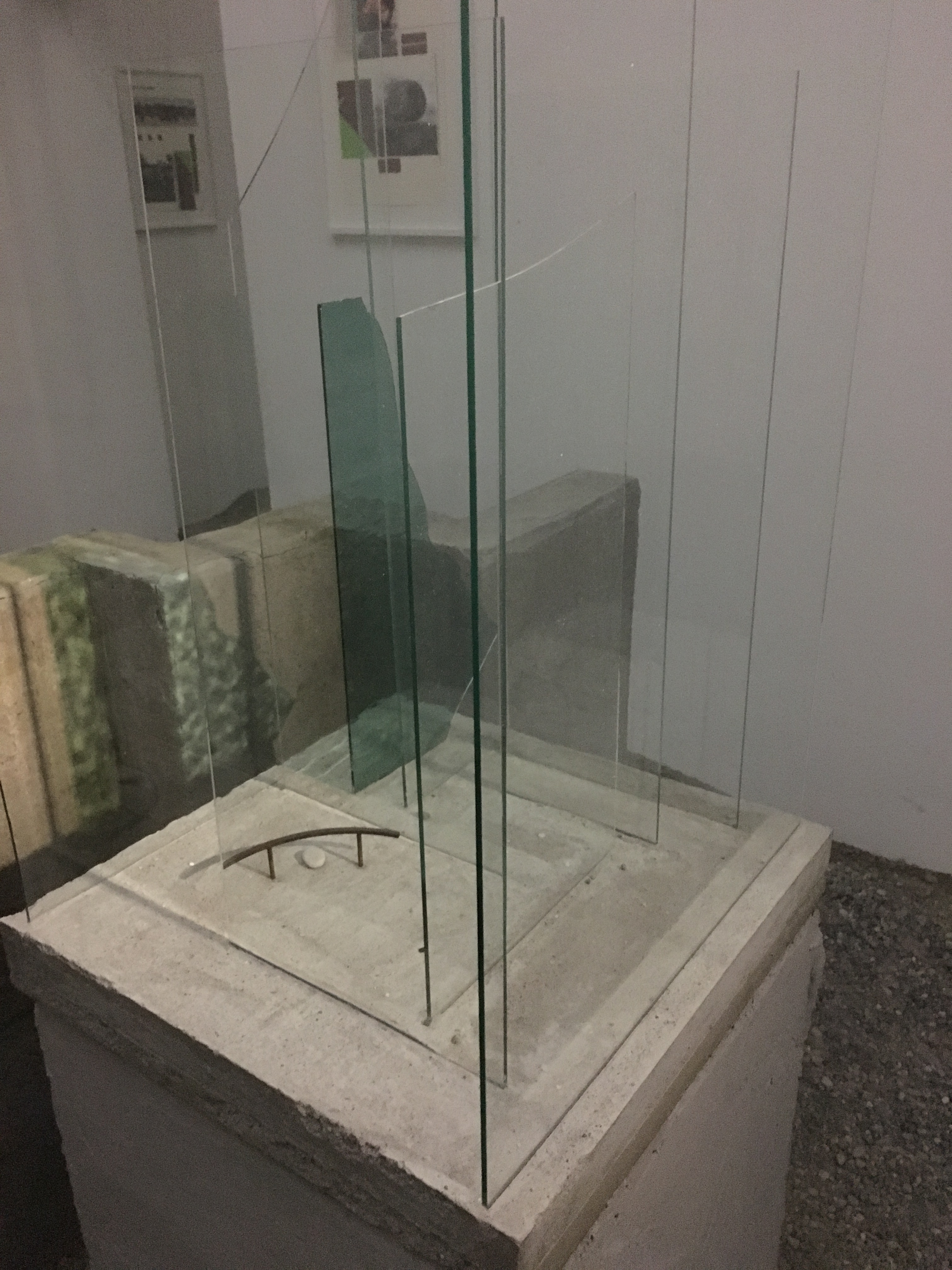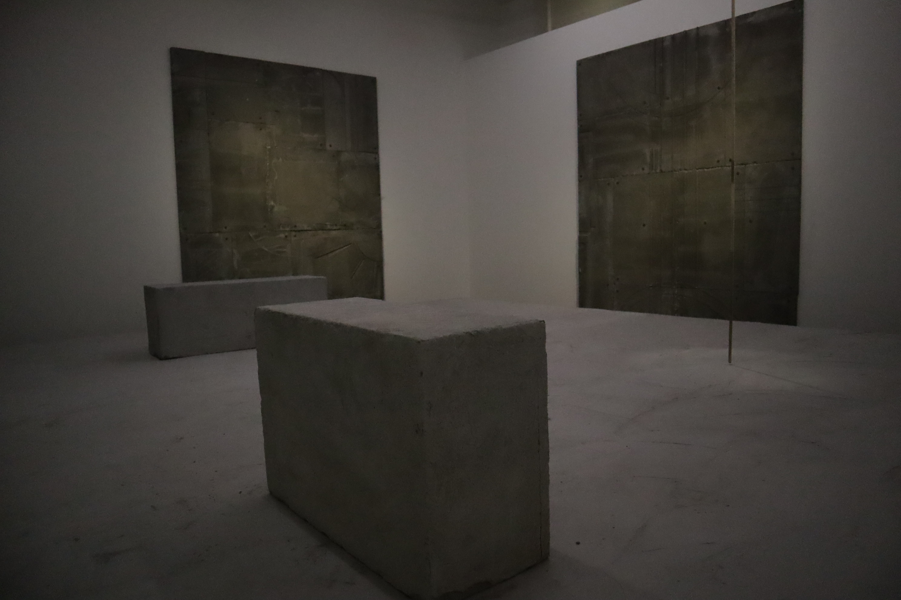 Ihrer Auffassung nach leben wir in einer Welt des Lichtes, in der die Dunkelheit meistens negativ konnotiert sei; mit Abgründigem, Angst und Unsicherheiten. Diese Unsicherheit hat sie bei mir tatsächlich provoziert mit den unebenen Böden, die unter jedem Schritt wegrutschen, der Dämmerung in den Ausstellungsräumen und den aus dem Nichts auftauchenden mit Zement verputzten Wandelementen. Der Ausdruck „Brett vor dem Kopf“ wandelt sich hier zu „Beton vor dem Kopf“!