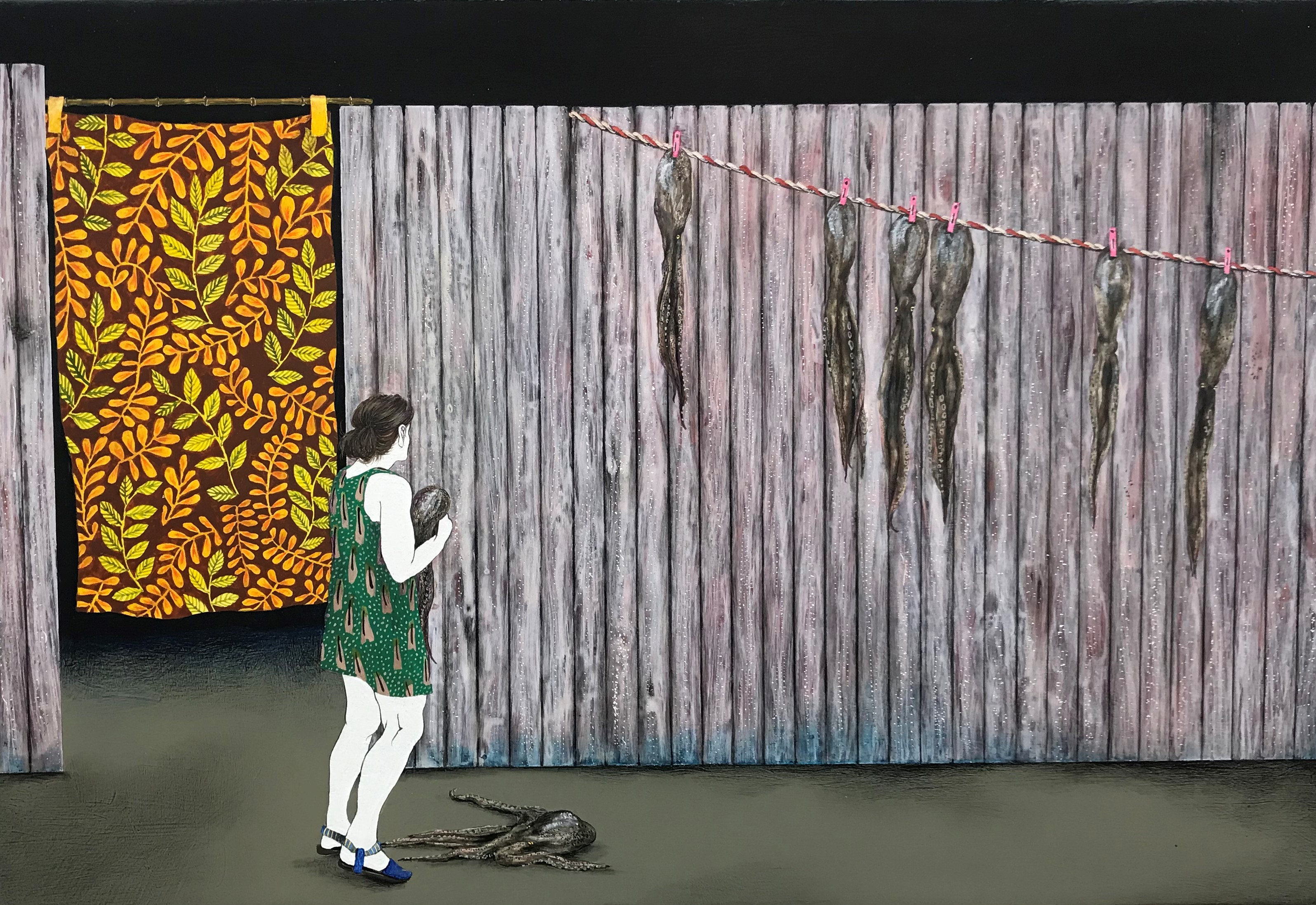 Stadtkulissen mit Backsteinen und Wellblech, Wäscheflattern im Wind mit wartenden Frauen, gekochte Meeresfrüchte mit Frau als Beilage, überall scheint die Lebenswirklichkeit von Frauen auf, thematisiert sie auf überraschende Weise ihre Einsichten. Dabei versucht sie, sehr spielerisch mit der Tradition und der Moderne umzugehen. Etwa indem sie Architektur, Kleidung, Kulinarik aus verschiedenen Zeitperioden mischt. Auf allen in dieser Ausstellung präsentierten Bildern sind Frauen die Protagonistinnen.