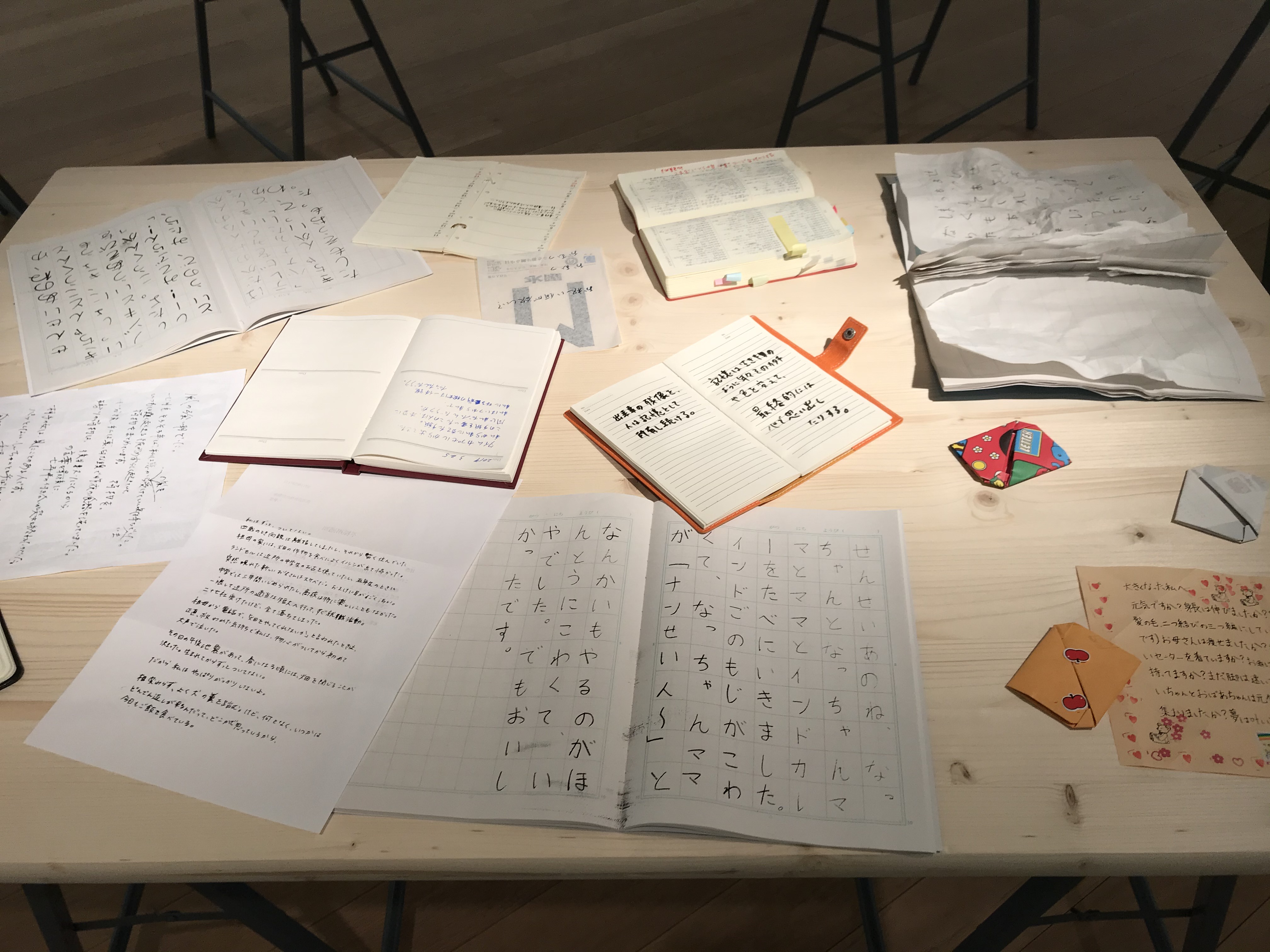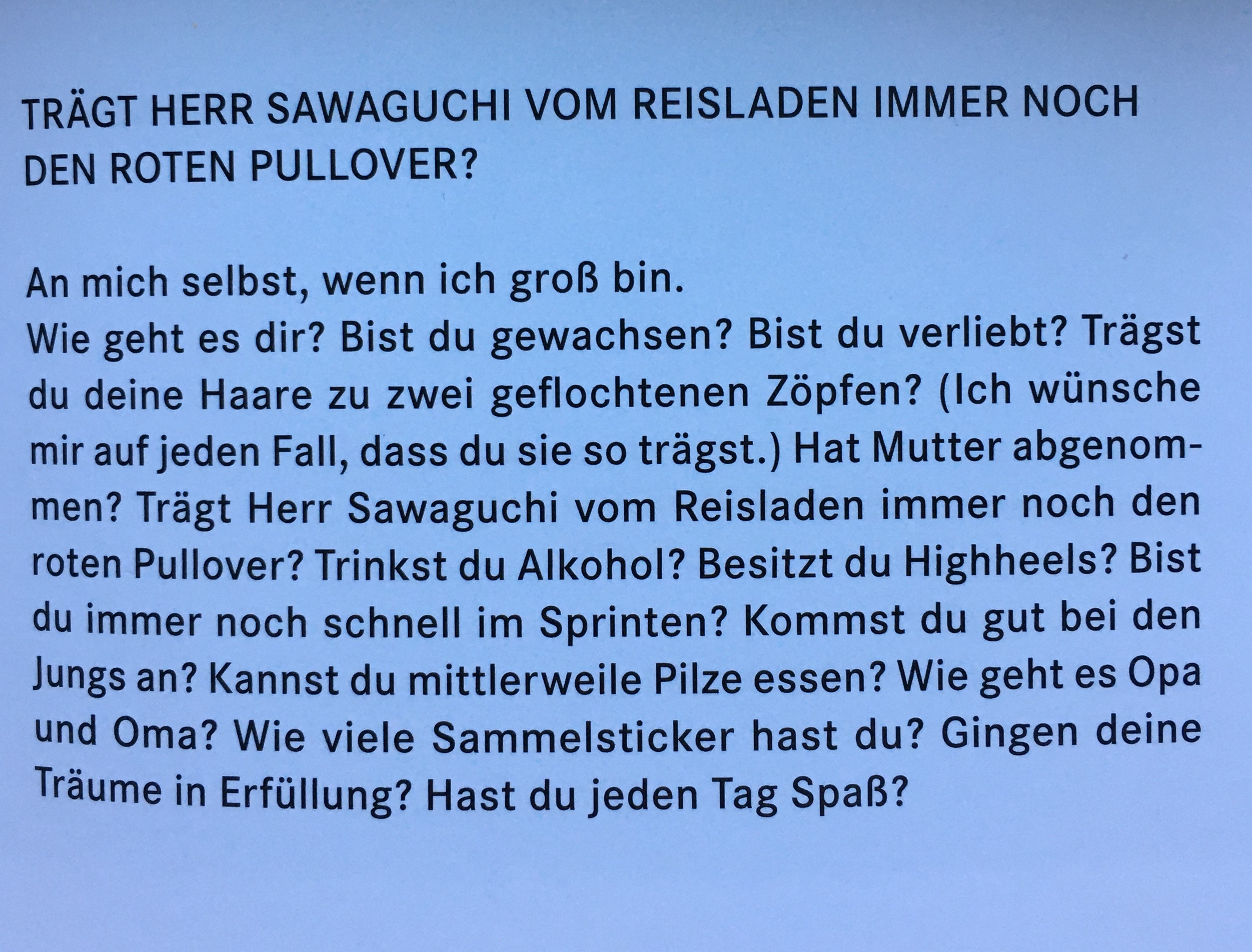 Das SPIEL ist das grosse Thema auch in ihren kleinen philosophischen oder ironischen Erzählungen, die ihr oft den eigentlichen Anlass zum künstlerischen Tun geben. Einblicke in die Realität von mehreren weiblichen Ichs werden uns so gewährt. Diese Notizen sind in verschiedenen Schriften von unterschiedlichen Personen geschrieben und diese Handschriften werden dann als Siebdruck auf die verschiedenen Materialien wie Packpapier, Flyer, Kalenderblätter oder in einem Wörterbuch gedruckt.