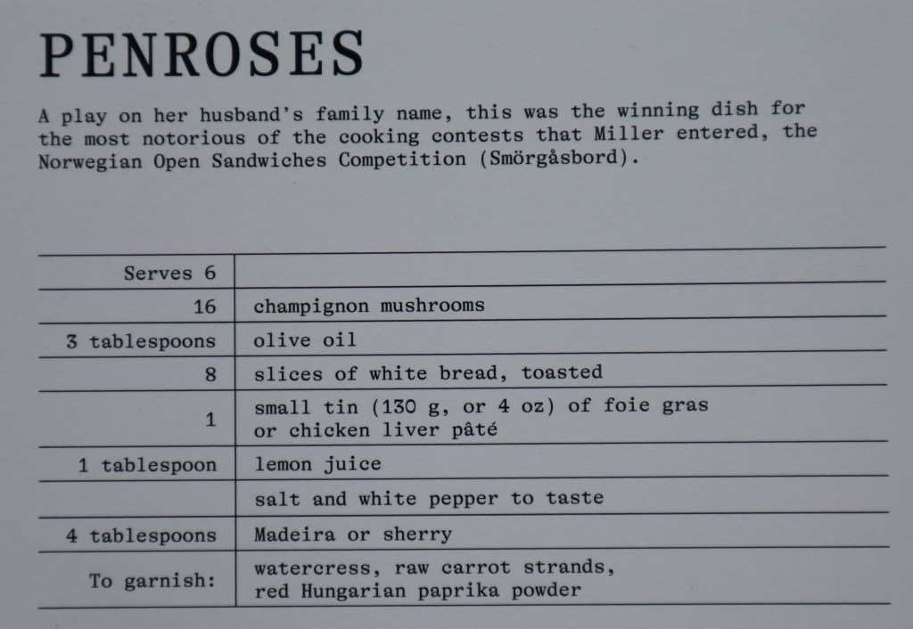 Mit Kind und Küche erfand sie sich als eine ganz andere Frau. Im Hinterkopf müssen wir die vorherigen Jahre des Mangels und des Hungers haben. Das Landleben mit grossem Gemüsegarten und den Besuchen der Londoner Kulturszene wurde zu ihrem neuen kreativen Experimentierfeld. Sie widmete sich mit Hingabe dem Kochen. Bei ihren mannigfaltigen früheren Reisen und ihrem Leben in Kairo hatte sie die verschiedensten Inspirationen gesammelt. Zudem absolvierte sie auch Gourmetkurse. Aus all dem kombinierte sie «surrealistische» Menüs. Alle kamen zu ihr aufs Land, ob Picasso, Miro oder Tapiè und machten mit bei den fantasievollen Rollenspielen, die die Gastgeberin sich ausgedacht hatte. Hier habe ich euch ein paar Koch-Rezepte von ihr. Allerdings ohne Gewähr.