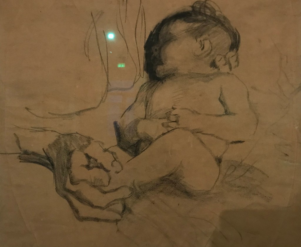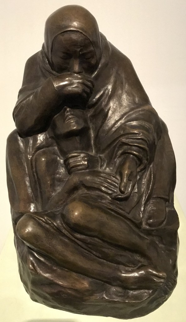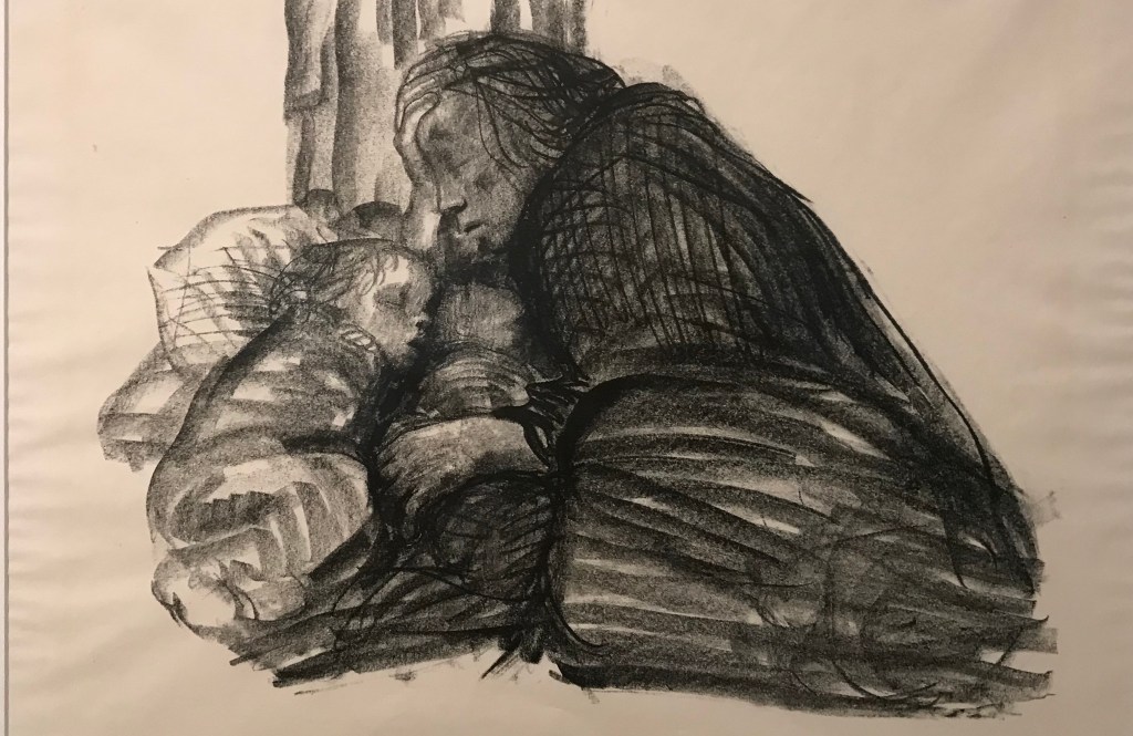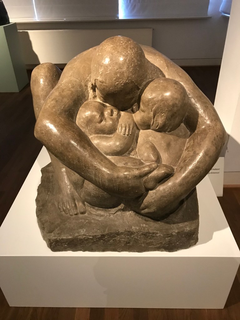 1914 ist die grosse Zäsur in ihrem Leben. Ihr erst 18-jähriger Sohn Peter fällt im Ersten Weltkrieg. Sie verarbeitete diesen Schlag auch künstlerisch wie mit dieser Pietà: Mutter mit totem Sohn. In einer früher Zeichnung war sie wohl noch ganz in ihrem Schmerz gefangen. In der erst 1937 geschaffenen Skulptur ging es ihr, wie sie in ihrem Tagebuch vermerkte, mehr um das Nachsinnen.