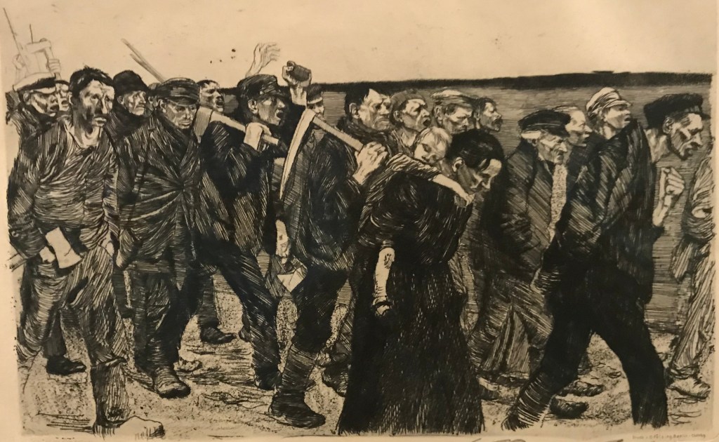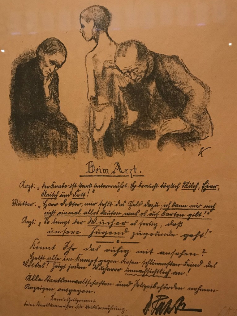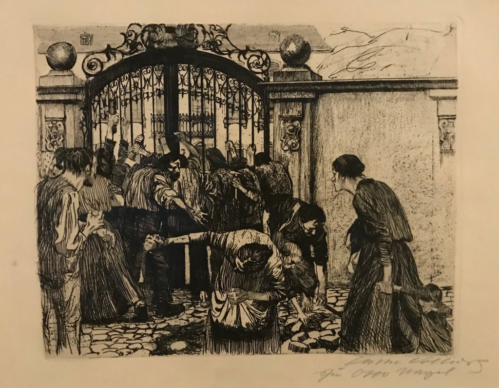 Berlin in den Jahren vor, während und nach dem Ersten Weltkrieg müssen wir uns vorstellen als rasch wachsende Industriestadt mit mannigfaltigen sozialen Problemen: Prekäre Wohnverhältnisse, Gewalt gegen Frauen und Kinder, schlechte Arbeitsbedingungen, Arbeitslosigkeit, Hunger, Alkoholsucht und fehlendes Geld für medizinische Behandlungen. So sah oft die Realität aus für die DurchschnittsbewohnerInnen. Und dies ganz hautnah erfuhr Käthe Kollwitz durch die Praxis ihres Mannes. Es wurde selbstverständlich für sie, sich als Künstlerin mit diesen Themen auseinanderzusetzen.