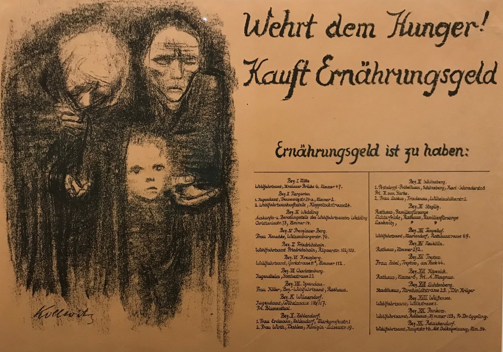 Als sich nach dem Krieg an den Kunstakademien endlich auch die Frauen als Studentinnen immatrikulieren konnten, erhielt Käthe Kollwitz 1919 eine Professur an der Preussischen Akademie der Künste. Keinesfalls verlor sie dabei ihre Achtsamkeit für die dramatischen Lebensbedingungen der armen Bevölkerungsschicht Berlins. Und es gab viel zu tun. Die Hyperinflation und die hohe Arbeitslosigkeit zeigten ihre desaströsen Spuren. In der Not waren auch unerwünschte Schwangerschaften ein grosses Problem der Frauen. Ueberall setzte sie ihr künstlerisches Talent ein, um auf diese Probleme aufmerksam zu machen. Aber sie half auch tatkräftig bei der Schaffung von Suppenküchen mit. Zur Finanzierung sollte «Ernährungsgeld» gekauft werden.