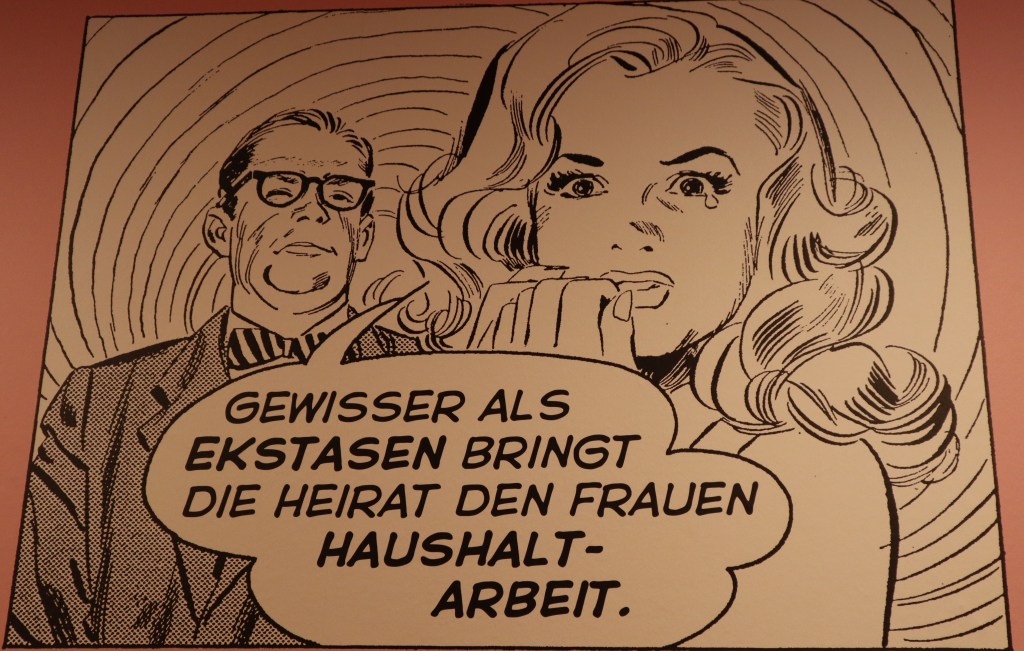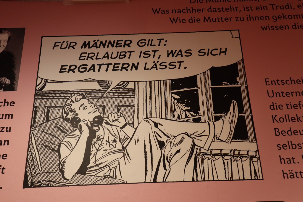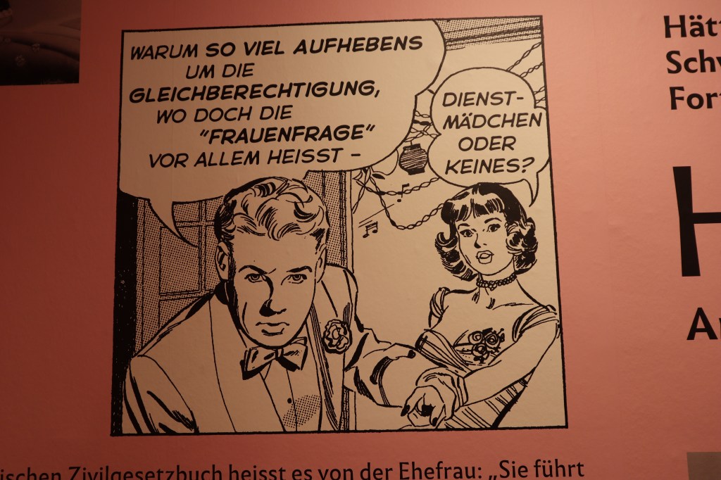 Wir müssen uns in die Fünfziger Jahre des 20. Jahrhunderts zurückdenken. Das Ideal ist die Kleinfamilie mit dem auswärts arbeitenden und Geld verdienenden Vater und der tüchtigen, sparsamen und gepflegten Hausfrau, die für die Erziehung der Kinder und den Haushalt zuständig ist. In der Schweiz dürfen die Frauen nicht mal wählen und das damalige Ehegesetz verbietet es den Gattinnen, ohne die Zustimmung des Ehemannes einer Erwerbsarbeit nachzugehen. Oberhaupt der Kleinfamilie ist der Pater Familias, der HausHERR. Das Leben spielt sich in den beiden Sphären Oeffentlichkeit und Häuslichkeit ab. Dabei ist klar, dass der Frau mit ihren «mütterlichen» Kompetenzen die häusliche Enge zugeteilt wird. Sogar die Frauenverbände übernehmen diese dualistische Ansicht, denn Frauen und Männer wären eben «andersartig». Und auch der Bundesrat meint damals, dass es den Frauen beim Denken an «logischer Konsequenz und Sachlichkeit» fehle.