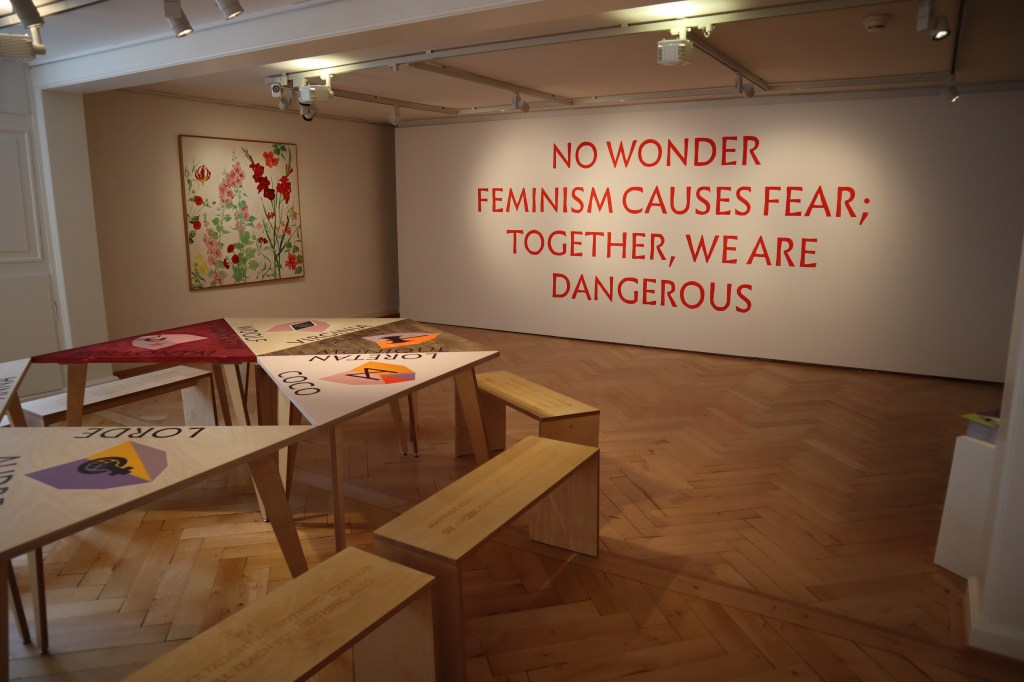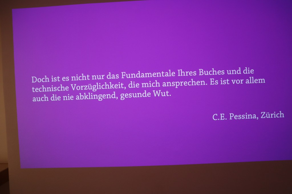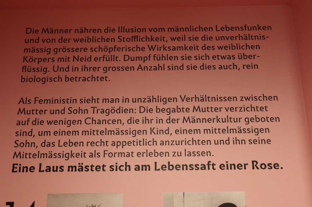 Ich kann euch ihren Witz, Sarkasmus und ihre stupende Analyse nur näherbringen, wenn ich euch einige ihrer Originalzitate zeige, von denen ein paar auf den Wänden des Ausstellungsraumes zu betrachten sind.