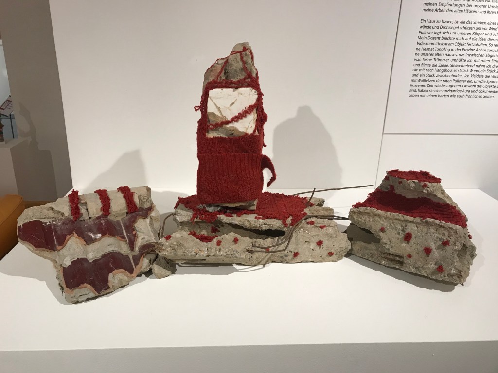 WU XUE QIAN meint, dass sich in unserer schnelllebigen und mobilen Zeit auch der Begriff Heimat und ganz konkret das Elternhaus verändern. Sie wollte ihre Empfindungen bei der Umsiedelung ihrer Familie darstellen. Wie der Körper durch Kleidung geschützt wird, braucht es die Wände eines Hauses, um uns vor den Elementen zu schützen. Sie reiste zurück in ihre Heimat zum alten Haus. Dort umhüllte sie die Resten der Ruine mit roten Strickpullovern. Stellvertretend nahm sie verschiedene Stücke des Hauses mit. Diese sind in der Ausstellung nun mit roter Wolle geschützt.
