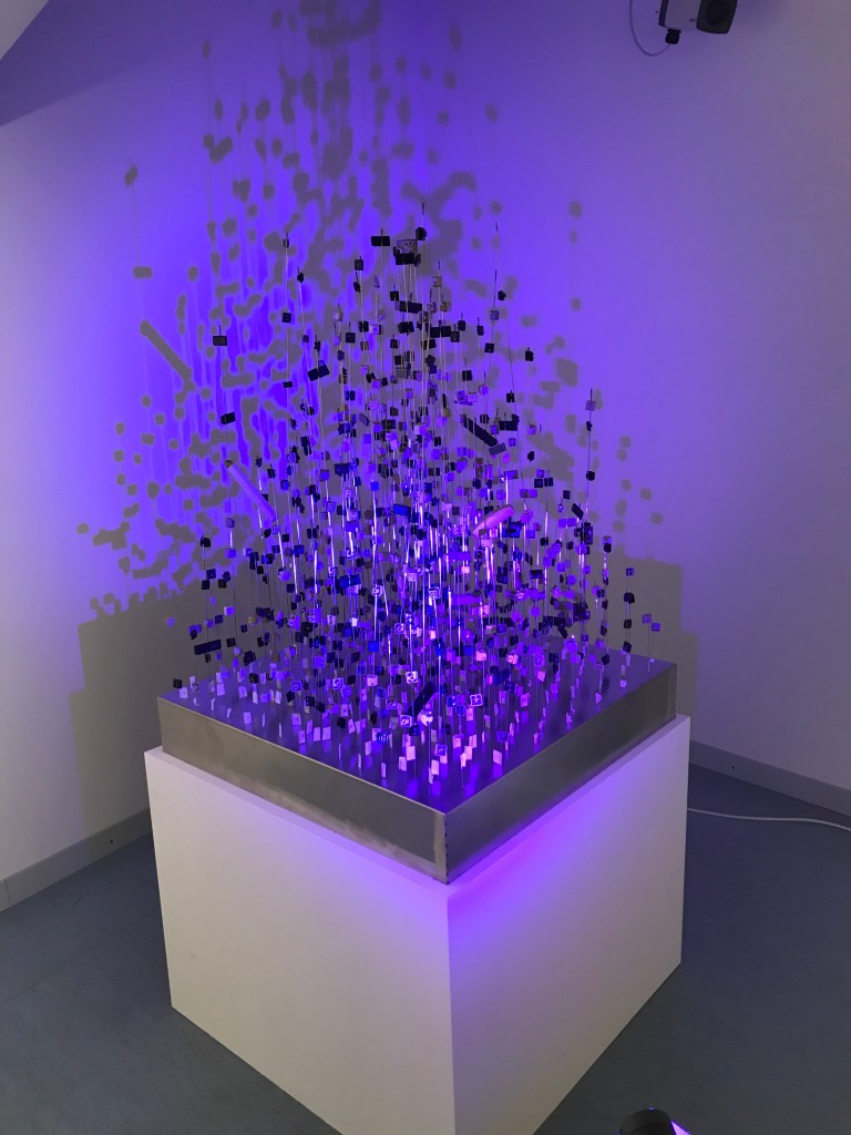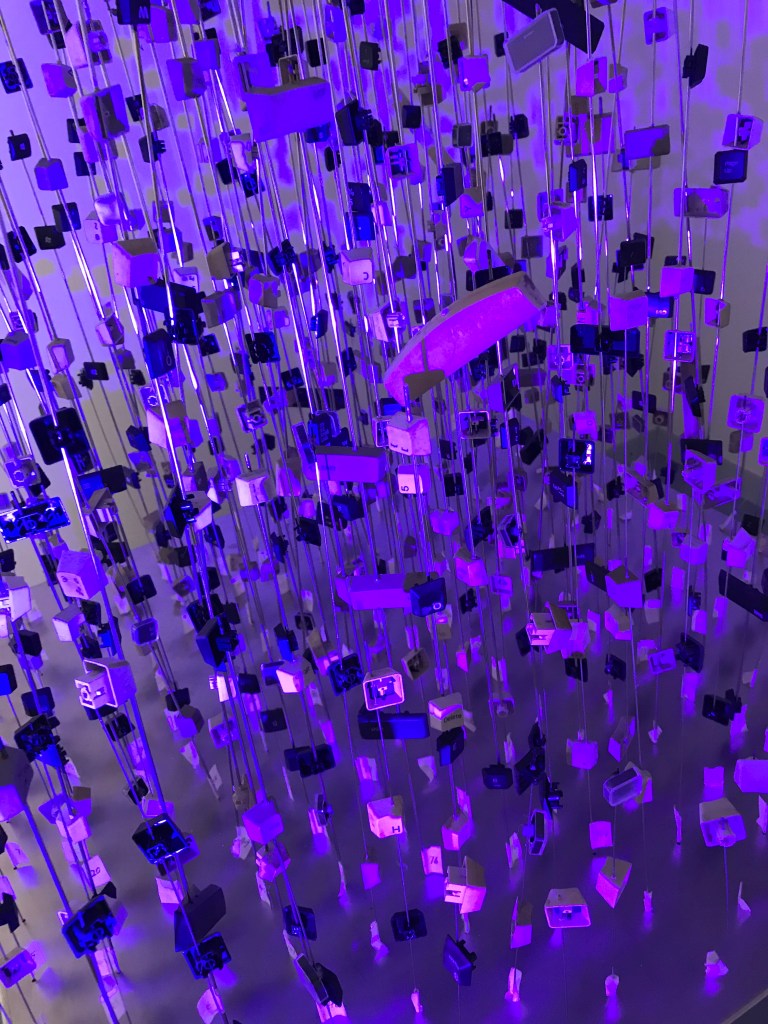 JIANG SHAN liess sich vom Schattenwurf einer Kerze inspirieren zu ihren Gedanken über die Schnelllebigkeit. Computer haben das Leben beschleunigt, auch das Schreiben. Sie trug aussortierte Computertastaturen zusammen und fädelte mehr als 1000 Plastiktasten auf 232 Eisenstäbe. Entstanden ist ein sinnliches Objekt, das je nach Lichteinfall einen anderen Schattenwurf zeigt.