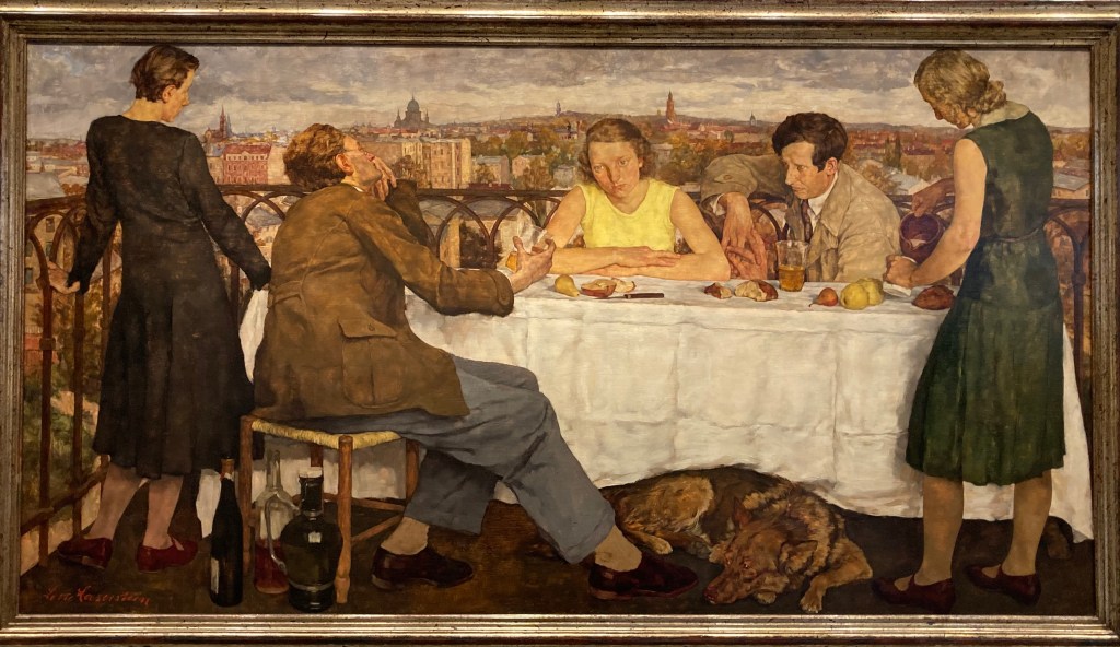 Sie nahm ich mir zum Vorbild und ging quasi blind an den durchaus exquisiten Werken der Künstler vorbei und betrachtete ausschliesslich die Kunst von Künstlerinnen genauer. Im Foyer erfreute mich LOTTE LASERSTEINS (1898-1993) «Abend über Potsdam», das diese 1930 mitten in der Wirtschaftskrise gemalt hatte. Es wurde erst 2010 mithilfe von mehreren Stiftungen erstanden. 80 Jahre vorher hätte es günstig erworben werden können. Denn wo hatte die Laserstein ihre Muse und Freundin Traute Rose kennengelernt? In einer Suppenküche, die sie als Studentin hungrig aufsuchte. Die Laserstein war ja eine der ersten Studentinnen, die an die Berliner Kunstakademie kamen. Sie litt sehr unter den höhnischen Kommentaren ihrer Kommilitonen. Dort lernte sie aber auch die Königsdisziplin den Akt. Zwar ist mein Lieblingsbild von ihr «Ich und mein Modell» ein Porträt der beiden Freundinnen, aber wo sind ihre Akte? All diese wunderbaren Aktgemälde und Aktzeichnungen, von denen ich nur mal «In meinem Atelier» erwähne. Nichts davon ist vorhanden .