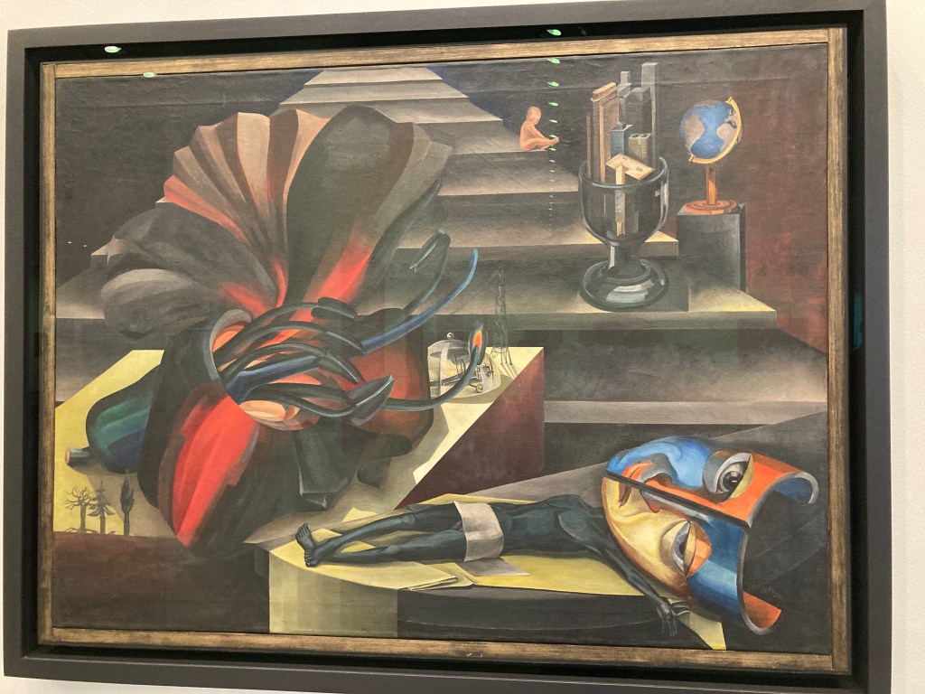 Und wenn die Erbengemeinschaft von HANNAH HÖCH (1889-1978) nicht das Bild «Die Treppe» der Nationalgalerie geschenkt hätte, könnten wir nicht mal ein Exemplar dieser bedeutenden und gesellschaftskritischen Künstlerin hier ansehen, die für ihre Collagen bekannt war. Angefangen hatte sie aber als Dadaistin. By the way, im Kunsthaus Zürich könnt ihr in der Sammlung ihre berühmte «Dada-Mühle» betrachten. Da sie später durch die Nazis mit einem Ausstellungsverbot wegen entarteter Kunst belegt war, bestritt sie ihren Lebensunterhalt als Grafikerin mit Entwürfen zu Schutzumschlägen von Romanen. In ihren letzten Jahren kam sie doch noch zu Ehren und wurde an die Akademie für Künste in West-Berlin berufen. Zudem existiert der HANNAH-HÖCH-PREIS für ein hervorragendes künstlerisches Lebenswerk.