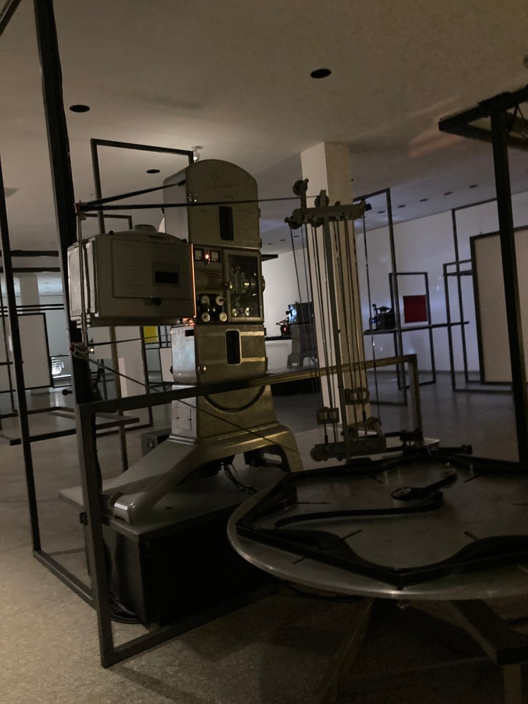 Neben der Sammlung existiert ein separater Raum für wechselnde Exhibitionen. Dieser wird aktuell bespielt von der zeitgenössischen Künstlerin ROSA BARBA. Der Titel: In a Perpetual Now. Sie ist keine Filmerin, obwohl sie Kameras benützt, sie erzählt auch keine klassischen Geschichten. Sie schafft quasi Architektur mit ihren Kameras, auf dem Boden liegenden Filmstreifen, Projektoren und dazu tauchen wir ein in eine undefinierbare Geräuschkulisse. Anscheinend will sie unsere festen Vorstellungen von Zeit, Raum und Dingen auflösen.