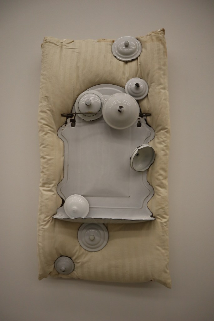 Ich irrte mich ziemlich stark, als ich dieses Werks ansichtig wurde. Ich wäre eine Wette eingegangen, dass es von Meret Oppenheim ist und ich dieses damals an der erstaunlich vielfältigen Retrospektive im Kunstmuseum Bern einfach übersehen hatte. Aber nein, die Künstlerin heisst Doris Stauffer (1934-2017) und sie nannte es «Schneewittchen und die acht Geisslein», 1966.