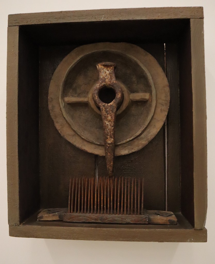 Ihr werdet, wie ich, neben weltbekannten Künstlerinnen wie Louise Bourgeois oder Miriam Cahn auch einige Namen entdecken, von denen ihr kaum gehört habt. Exemplarisch zeige ich euch die nächsten drei davon: Da ist dies zum einen Eva Wipf (1929-1978) mit ihrem religiös gefärbten Universum und mystischen Denken, die ihre seelische Zerrissenheit in solchen Schreinen ausdrückte.