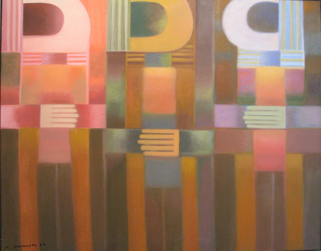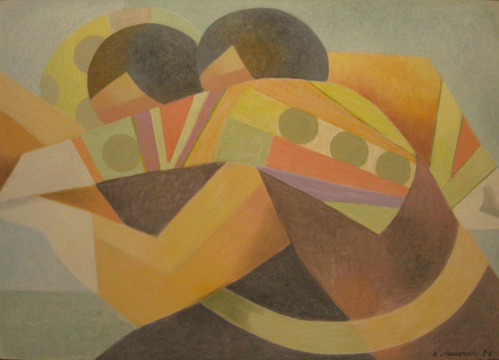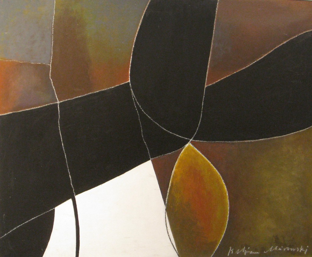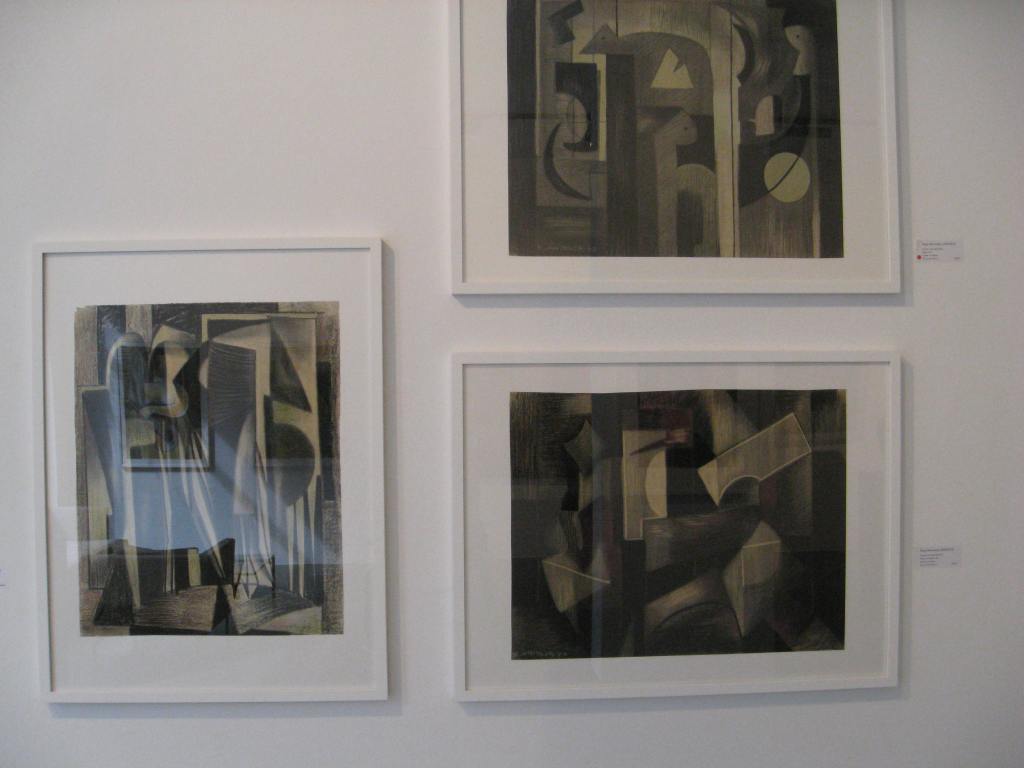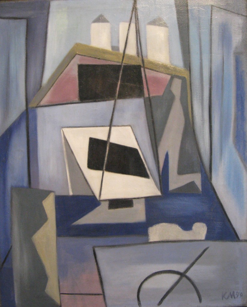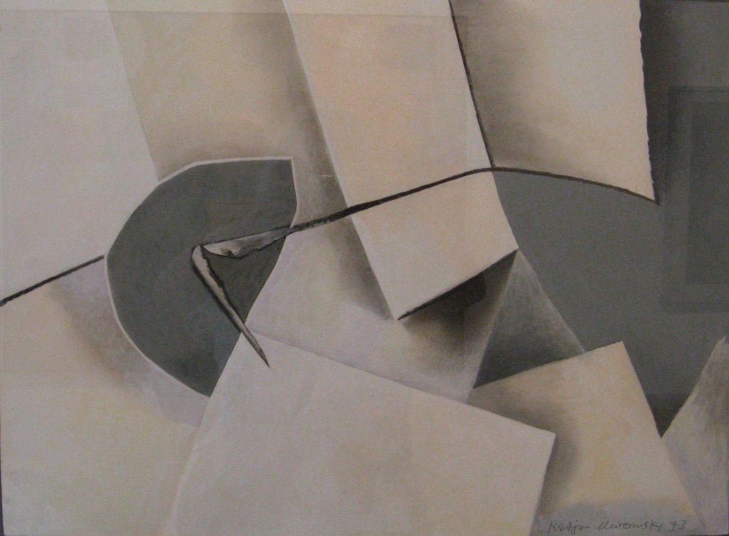 Anfang der fünfziger Jahre wählte das Ehepaar Meirowsky zusammen mit befreundeten Künstlern Ibiza zu seinem neuen Lebensmittelpunkt. Sie entflohen dem bedrückenden Nachkriegsdeutschland mit seinen schrecklichen Erinnerungen auf die sonnige Insel. Die Eindrücke aus beiden Lebenswelten inspirierten Katja Meirowskys folgenden Werke. Die unbekannten Motive faszinierten sie. Ihr Stil ist schwer fassbar, da es keinen einzelnen gibt. Sie folgte kaum künstlerischen Moden. Eher kubistische Figuren wechseln sich ab mit Landschaften. Dann überraschen wieder abstrakte Formen. In einem kurzen Film in der Ausstellung zeigt sie ihre Offenheit. Sie sitzt vor der weissen Leinwand und im Off fragt jemand, was sie denn heute zu malen gedenke. Stets eine Zigarette zwischen den Fingern antwortet sie, das wisse sie nicht, das käme auf sie zu. Sie liess die Leinwand sprechen. Ihr künstlerisches Werk ist vielfältig und besteht aus Oel- oder Acrylbildern, Zeichnungen, Collagen und Siebdrucken. Dabei schöpfte sie aus ihren persönlichen Empfindungen. Innen- und Aussenwelt schoben sich ineinander. Auf mich wirken die Bilder ob abstrakt oder gegenständlich manchmal wie durch einen Schleier gedämpft, erreichen einen leicht träumerischen Effekt.