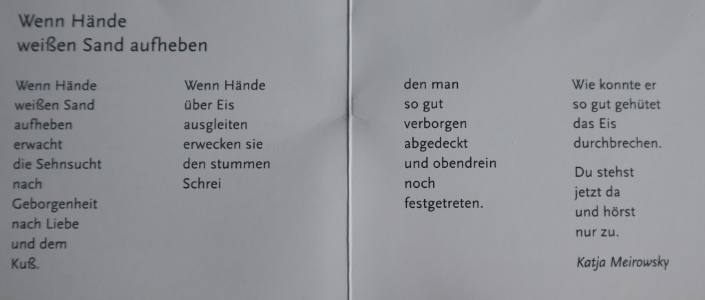Beide waren die Gründer von zwei Künstlerkabaretts „Die Quallenpeitsche“ und „Das Atelier“. Katja war ausserdem im auch von ihr initierten surrealistischen Kabarett „Die Badewanne“ als Darstellerin engagiert und entwarf die Bühnenbilder und Kostüme. Diese Kabaretts waren ihre Orte der „Freiheit und Frechheit“ mit Jazzmusik und Tanz. Hauptsächlich aber malte und zeichnete sie. Wobei das Schreiben ebenfalls einen hohen Stellenwert für sie hatte. Damit ihr davon einen Eindruck bekommt, zeige ich euch eines ihrer Gedichte.