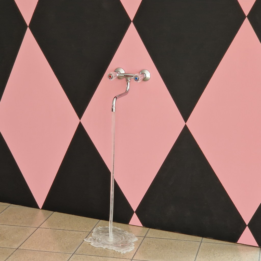 Die magenta- und rosafarbenen Stellflächen im Rautenmuster beherrschen den Seitenlichtsaal. Und wer genau hinschaut, erblickt den Wasserhahn, aus dem ein Strahl Epoxidharz «fliesst». Einerseits benützt sie die Leinwände als Bildraum, weitet sie jedoch auch zu Rauminstallationen aus.
