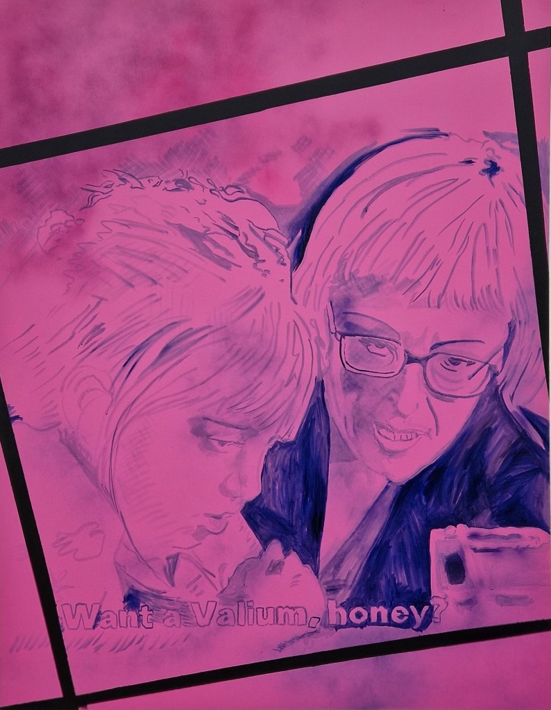 Mir gefallen die Themen auf den Bildern wie auf meinem Favoriten. Die Erwachsene zum Kind: «Want a Valium Honey?» Ist das Gesicht der weiblichen Person etwa Cindy Sherman, die sich mittels ihrer Selbstporträts mit Geschlechterklischees und Identität auseinandersetzt? Sherman habe ich jeweils nicht in Interaktionen mit anderen Personen in Darstellungen auf ihren eigenen Fotos gesehen.