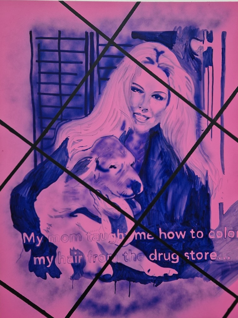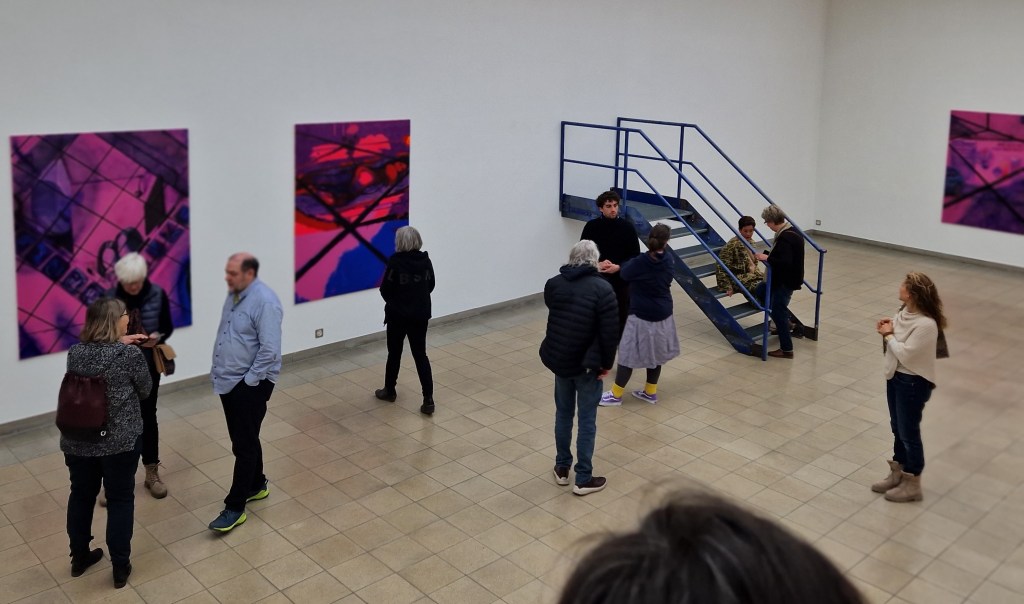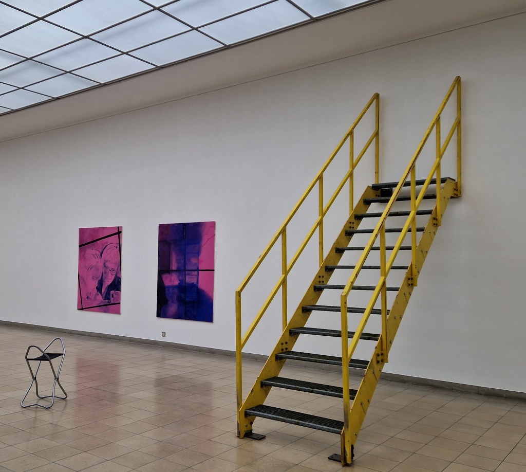 Der Wasserhahn im Seitenlichtsaal stellt die Verbindung dar zu den Gemälden von spiegelnden Fliesen im zweiten Ausstellungsraum. Dem Thema Malerei etwas Neues abzugewinnen, ist tatsächlich schwierig. Sie versucht dies hiermit. Das Raster auf den blau-pinken Bildern erinnert an die Quadrate der Fliesen. Doch nun hat sie auch noch figurative Elemente hinzugefügt. Dazu benützte sie verschiedene Bildvorlagen. Immer jedoch fotografische Vorlagen wie zum Beispiel Badezimmerspiegel-Selfies. «Im Selfie wird der private Raum des Badezimmers ja auch potenziell öffentlich. Es ist ein Spiel mit Aneignung.»
