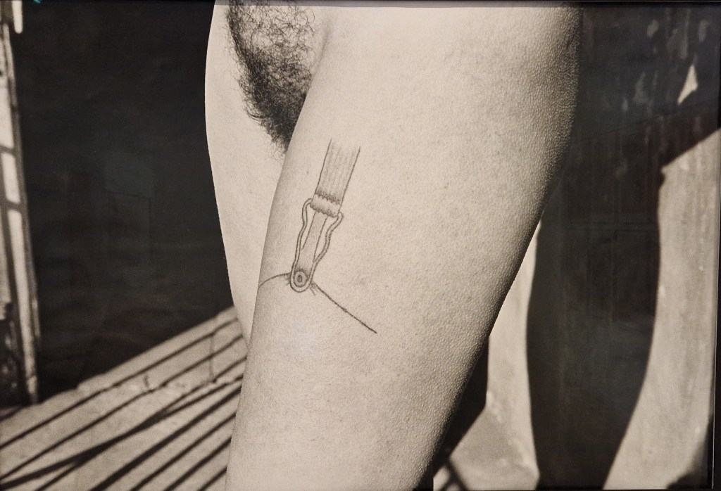 Die Frau als Sexualobjekt und Projektion macht sie zum Beispiel 1970 sichtbar, indem sie sich ein Strumpfband auf den Oberschenkel tätowieren lässt. Männliche Fantasie als körperlicher Schmerz.