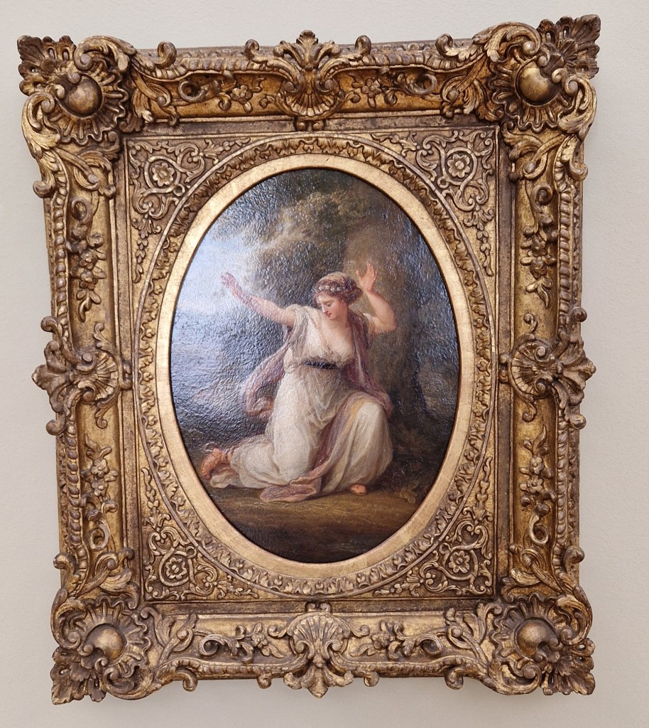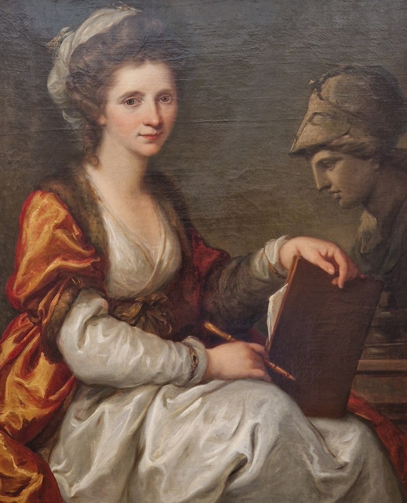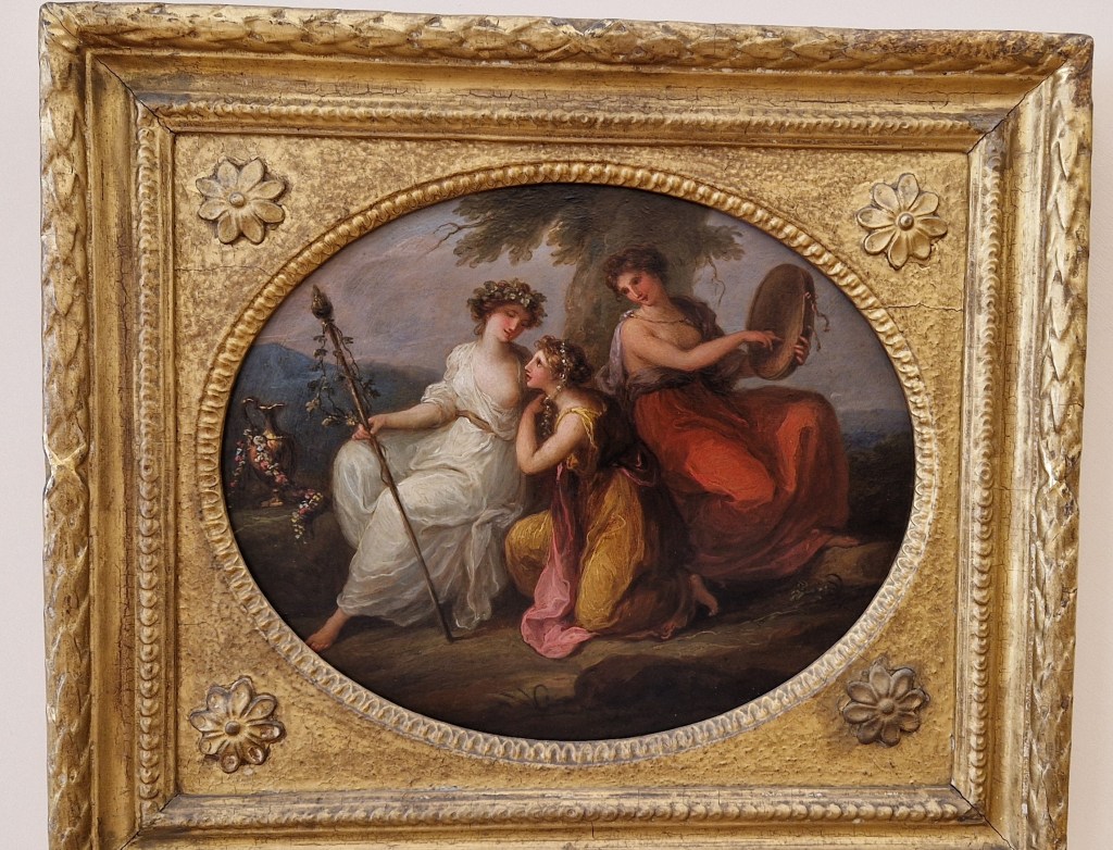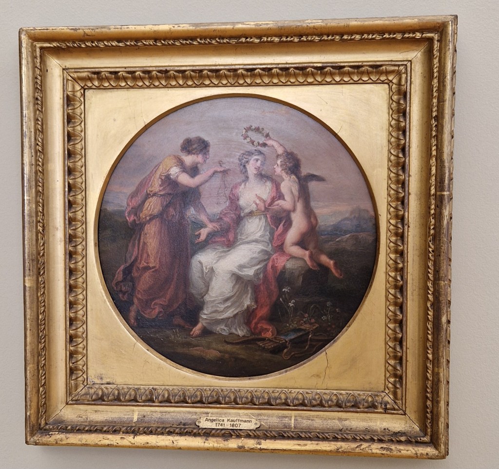 Aber nun zum Beginn: Sie wurde 1741 als einziges Kind ihrer Eltern in Chur geboren und wuchs im Bregenzerwald und im Veltlin auf. Ihr Vater war Maler und förderte früh ihr zeichnerisches Talent und brachte ihr Lesen und Schreiben bei. Von der Mutter lernte sie Deutsch, Italienisch, Englisch und Französisch. Diese unterstützte die musikalische Ausbildung der Tochter. Dass die Musik sehr wichtig für Angelika Kauffmann war, werde ich euch hiermit beweisen. Sie sang mit einer schönen Sopranstimme und spielte mehrere Instrumente wie Klavier und Laute. Sie trat als Jugendliche öffentlich als Sängerin auf und wurde in Italien als musikalisches Wunderkind gefeiert. In ihrem autobiografischen Gemälde «Am Scheideweg zwischen Musik und Malerei» zeigte sie zwischen den beiden Allegorien ihre Zerrissenheit auf: Angelika Kauffmann sitzt in der Mitte, nachdenklich. Links die Musik in rötlichen, warmen Farben gekleidet (oft mit Liebe, Leidenschaft assoziiert). Rechts die Malerei in kühlen Farben wie Blau oder Weiss dargestellt (mit Klarheit, Vernunft verbunden). Dieses Selbstbildnis müsst ihr selber im Web raussuchen. Es war nicht ausgestellt. Genauso wenig wie das erste Selbstporträt von ihr, das mir unter die Augen kam: die junge Kauffmann als Sängerin. Übrigens heisst das von mir gewählte Titelwerk «Drei Sängerinnen».