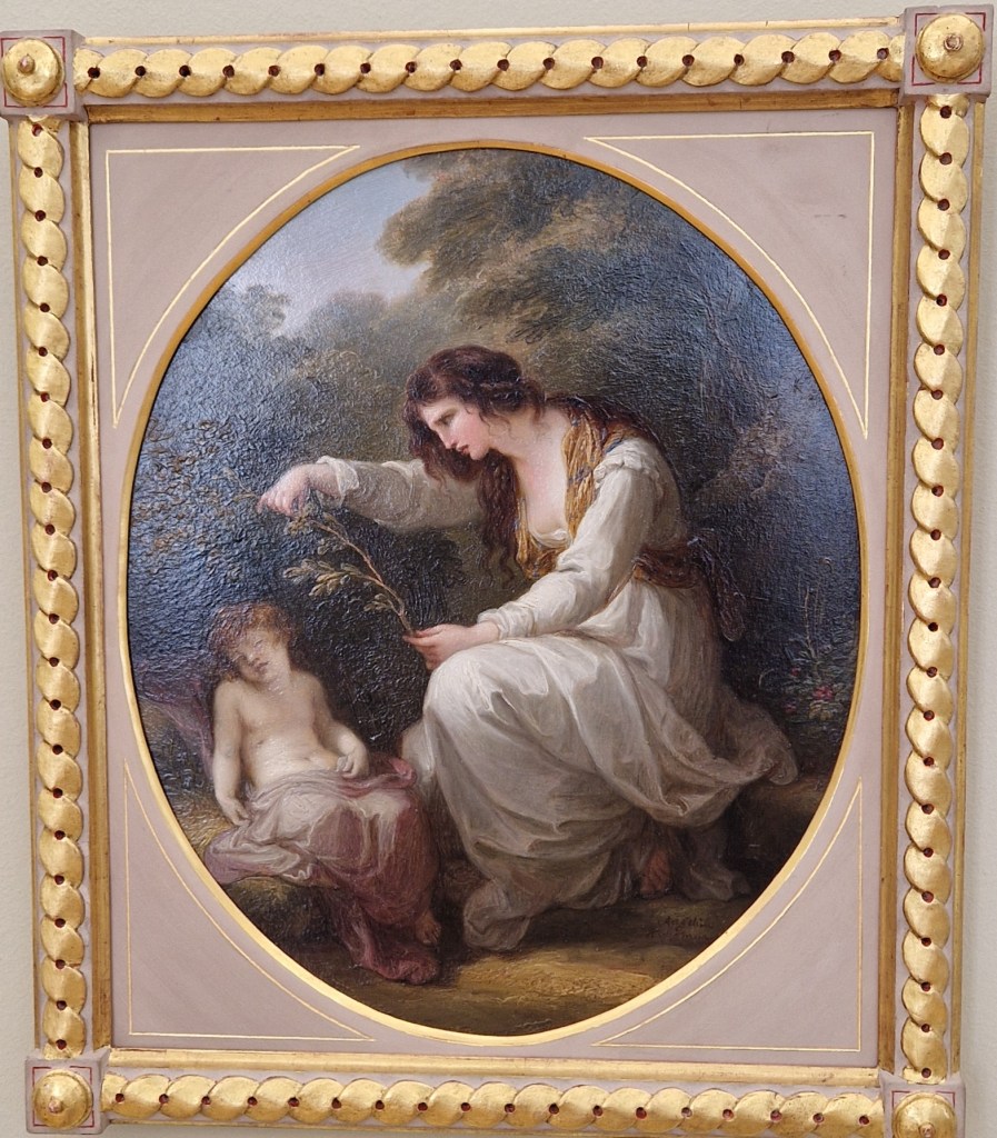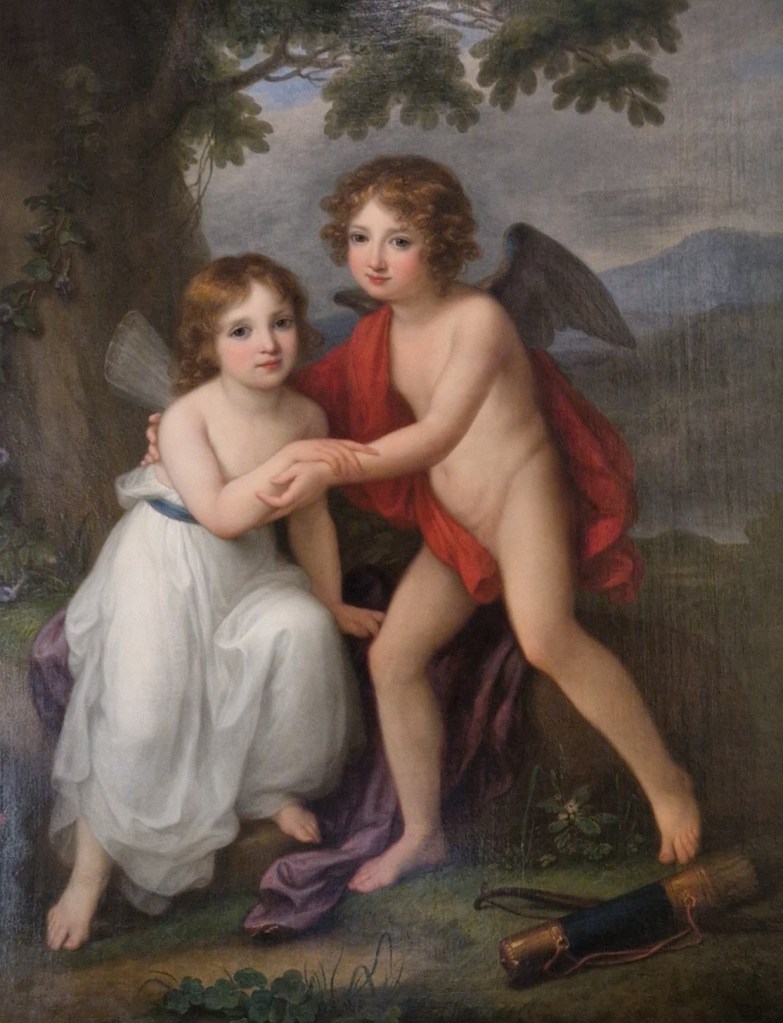 Auf ihren Reisen und bei ihren Aufenthalten spezialisierte sie sich auf Porträts und knüpfte wertvolle Kontakte zu berühmten Italienreisenden, vornehmlich Engländer:innen. Empfehlungen und Einladungen nach London blieben nicht aus und so zogen Vater und Tochter 1966 nach London. Ihre Mutter war bereits 1757 in Mailand verstorben. Während den fünfzehn Jahren in London wurde sie zur gefragtesten Porträtistin ihrer Zeit. Ihr Stil vereinte Elemente des Klassizismus mit Einflüssen des Rokoko. Hier nun ein Bildnis von Marie Louise Elisabeth Vigée-Lebrun, ihrer erfolgreichen französischen Künstlerkollegin, die die Hofmalerin von Marie-Antoinette war und das Gemälde von Amor und Psyche, für das die Kinder von Lord Plymouth Modell standen.